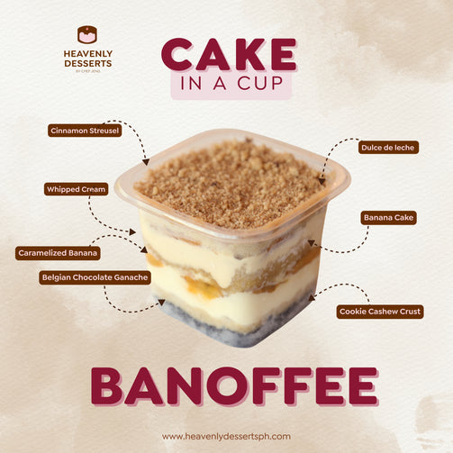 Layers of Oreo Cashew Crust, Belgian Chocolate Ganache, Banana Cake, Whipped Cream with Caramelized Banana, Dulce de leche and Cinnamon Streusel topping