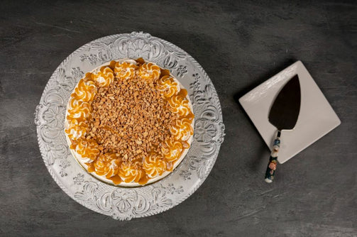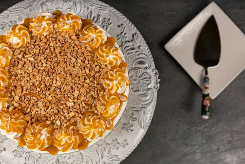 Layers of chiffon cake, Caramel whipped cream frosting and loaded with toasted cashew nuts