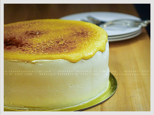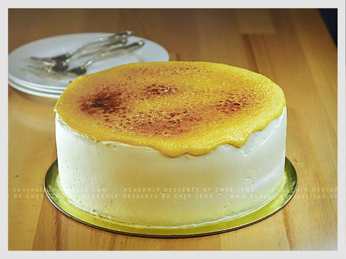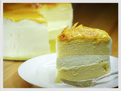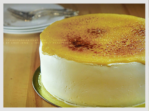 Made of 2 layers of vanilla chiffon cake with whipped cream filling topped with rich custard with a layer of caramelized sugar